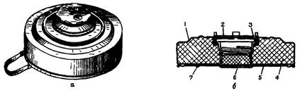 Рис. 17. Мина ТМ-62М: а - общий вид мины с МВЧ-62 в транспортном положении; б – разрез мины с пробкой; 1 - корпус; 2 - пробка; 3 - прокладка; 4 - заряд; 5 – дно; 6 - дополнительный детонатор; 7 - проушина для крепления ручки |