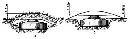Рис. 18. Установка мин серии ТМ-62 с взрывателями МВЧ-62, МВЗ-62, МВП-62М, МВП-62 или МВ-62: а - грунт средней твердости и в рыхлый грунт; б - в твердый грунт |