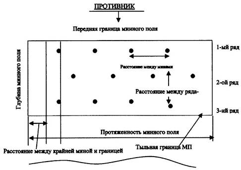ПТМП из противогусеничных мин фугасного действия (ТМ-57, ТМ-62) устанавливается в 3-4 ряда с расстоянием между минами в ряду (шагом минирования) 4-5 м, между рядами - 30-40 м. ПТМП из противоднищевых мин устанавливаются с шагом минирования 10-11 м. Схема типового минного поля представлена на рис. 19.