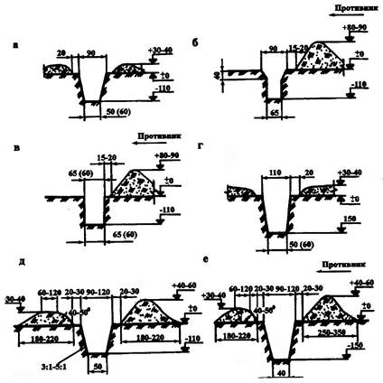 Рис. 21. Профили траншей: а - основной, отрываемый БТМ-3 (ТМК-2); б - основной, отрываемый ПЗМ-2; в - основной, отрываемый ПЗМ-2 (ТМК-2) в мерзлых грунтах; г - полный, отрываемый БТМ-3 (ТМК-2); д - основной, отрываемый вручную; е - полный, отрываемый вручную |
