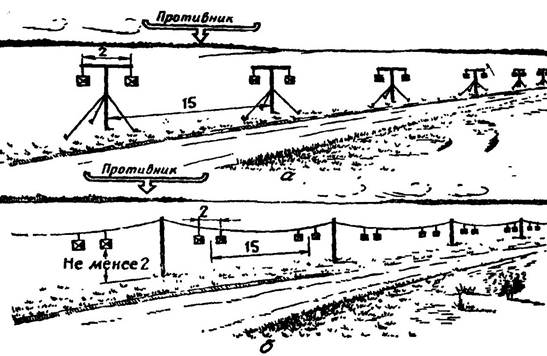 Рис. 27. Устройство линейных масок-помех из уголковых отражателей ОМУ (размеры в м): а - установкой на Т-образных опорах. На устройство 1 км требуется 14-15 чел.-ч; б - подвеской к проводам. На устройство 1 км требуется 3 - 4 чел. |