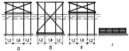 Рис. 33. Схемы промежуточных опор а - свайной; б - рамной; в - свайно-рамной; г - клеточной.