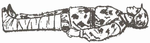 | Шину накладывают с его наружной стороны от подмышки до пятки, а с внутренней стороны -от паха до пятки. |