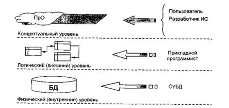 В литературе по базам данных упоминаются три уровня представления данных — концептуальный, внутренний и внешний (рис. 1).