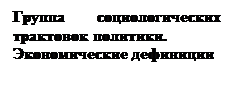 Социологические определения политики, основываясь на социологическом подходе, характеризуют ее через другие общественные явления: экономику, социальные группы, право, мораль, культуру, религию. В соответствии с отражаемой сферой общества их можно подразделить на экономические, стратификационные (социальные), правовые, этические (нормативные) и т.д.