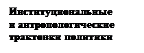«Властные» определения политики отражают ее сущность, важнейшее конституирующее качество. Они конкретизируются и дополняются с помощью институциональных дефиниций. Последние характеризуют политику через организации, институты, в которых воплощается и материализуется власть, и прежде всего через важнейший институт —государство. Политика предстает в этом случае как «участие в делах государства, направление государства, определение форм, задач, содержания деятельности государства»[6].
