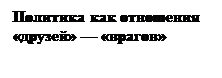 Политическое качество возникает в результате «уплотнения» общественных противоречий, их осознания как отношений «друзей» — «врагов». Враг — это кто-то «чужой», представляющий угрозу данному субъекту или его интересам, друг же — это союзник, помощник в достижении целей.