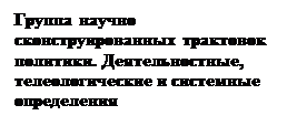 Разнообразные научные определения политики могут быть систематизированы и подразделены на несколько групп, каждая из которых внутренне дифференцирована. Критериями выделения таких групп служат используемые для характеристики политики общие исследовательские подходы: социологический, субстанциальный (выясняющий материю, основу явления) и системный, а также акцентированные в определениях политики ее важнейшие конституирующие качества и функции в обществе. В соответствии с этими подходами можно выделить три группы определений политики: социологические, субстанциальные и научно сконструированные, связанные со специфической интерпретацией политики.