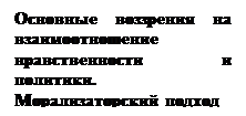 В мировой социальной жизни выделить четыре главных подхода к взаимоотношению политики и морали. Исторически первым из них является морализаторский подход. Выражаемый в крайней форме — в форме морального абсолютизма, — этот подход означает, что политика должна не только иметь высоконравственные цели (общее благо, справедливость и т.п.), но и при любых обстоятельствах не нарушать нравственные принципы (правдивость, благожелательность к людям, честность и т.п.), используя при этом лишь нравственно допустимые средства.
