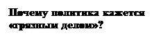 Почему же у многих создается впечатление о политике как о «грязном», аморальном занятии? Причины этого — не только в заблуждениях людей, но и в реальных чертах конкретной политики, а также в особенностях политики вообще.
