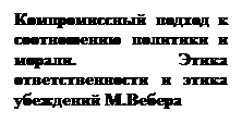 Один из важнейших обоснователей компромиссного подхода — Вебер. Он считал, что не следует полностью разделять этику и политику, хотя необходимо внимательно учитывать особенности последней. Не может существовать единого нравственного кодекса, одинаково применимого к деловым и сексуальным, к служебным и семейным отношениям, к друзьям и конкурентам и т.п. Поэтому этика должна учитывать особенности политики, главной из которых является применение насилия. «Именно специфическое средство легитимиого насилия <...> в руках человеческих союзов, — писал он, — и обусловливает особенность всех этических проблем политики»[35].