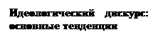 Реальное сосуществование и постоянное взаимодействие разнообразных идеологических течений обозначаются в политической науке понятием «дискурс». С содержательной точки зрения оно предполагает целый спектр возможных вариантов духовного взаимодействия: от взаимного дистанцирования идеологий до их объединения и соответствующего синтеза тех или иных идеалов, норм, политических требований и прочих своих элементов. Причем как в мировом или, предположим, региональном масштабе, так и в рамках отдельно взятой страны могут складываться самые разнообразные и противоречивые тенденции идеологического диалога. Но духовный климат, образовавшийся в том или ином государстве, как правило, всегда испытывает влияние более масштабных идейных веяний, свойственных межгосударственным и мировым политическим процессам.