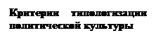 В основании типологии политических культур могут лежать достаточно приземленные факторы, отражающие, к примеру, специфику разнообразных политических систем (X. Экстайн), стран и регионов (Г. Алмонд, С. Верба), типов ориентаций граждан в политической игре (в частности моралистских, индивидуальных или традиционных — Д. Элазар), открытость (дискурсивность) или закрытость (бездискурсивность) политических ценностей к инокультурным контактам (Р. Шварценберг), внутреннюю целостность культурных компонентов (Д. Каванах), идеологические различия (Е. Вятр и др.).