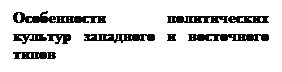 | Запад — убежденность, что власть может покоиться на физическом, духовном или ином превосходстве человека над человеком; — отношение к политике как к разновидности конфликтной социальной деятельности, которая строится на принципах честной игры и равенства граждан перед законом; — осознание самодостаточности личности для осуществления властных полномочий, отношение к политическим правам как к условию укрепления права собственности; примат идеалов индивидуальной свободы; — признание индивида главным субъектом и источником политики, отношение к государству как к институту, зависимому от гражданского общества, гаранту прав и свобод личности, орудию предпринимательской деятельности индивида и группы; — предпочтение личностью множественности форм политической жизни, состязательного типа участия во власти, плюрализма и демократии; предпочтение усложненной организации власти (наличия партий, разнообразных групп давления и т.д.); — рациональное отношение к исполнению правящими элитами и лидерами своих функций по управлению обществом, понимание необходимости контроля за их деятельностью и соблюдения правил контрактной этики; — примат общегосударственных законов и установлений (кодифицированного права) над частными нормами и правилами поведения, понимание различий в моральной и правовой мотивации политических действий граждан; — достаточно ощутимая идеологизированность политических позиций граждан. | Восток — уверенность в божественном происхождении власти, не связанном ни с какими человеческими достоинствами; — отношение к политике как к подвижнической, недоступной всем деятельности, подчиненной кодексу поведения героев и принципам божественного правления; отрицание случайности политических событий и понимание политики как средства утверждения консенсуса, гармонии и мира; — отрицание самодостаточности личности для осуществления властных полномочий, потребность в посреднике в отношениях между индивидом и властью; приоритет идеалов справедливости; политическая индифферентность личности; — признание главенствующей роли в политике элит и государства, предпочтение патроната государства над личностью; признание приоритета над личностью руководителей общин, сообществ, групп; доминирование ценностей корпоративизма; — предпочтение личностью исполнительских функций в политической жизни и коллективных форм политического участия, лишенных индивидуальной ответственности; тяготение к авторитарному типу правления, упрощенным формам организации власти, поиску харизматического лидера; — обожествление (сакрализация) правителей и их деятельности по управлению обществом, отсутствие убежденности в необходимости их контроля; — приоритет местных правил и обычаев (местного права) над формальными установлениями государства, тенденция к сглаживанию противоречий между нравственными традициями общности и законодательными установлениями как мотивами политического поведения; — менее выраженная идеологизированность позиций, веротерпимость (за исключением исламистских течений). |