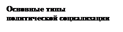 Различия в механизме передачи культурных традиций и норм в тех или иных политических системах позволяют выделить соответствующие типы политической социализации. К ним можно отнести: — гармонический тип политической социализации, отражающий психологически нормальное взаимодействие человека и институтов власти, рациональное и уважительное отношение индивида к правопорядку, государству, осознание им своих гражданских обязанностей;