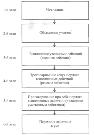 После этого ученики проговаривают вслух, как нужно осуществлять действие в установленном порядке. На всех этих четырех этапах освоения действия осуществляется внешняя деятельность с изучаемым объектом. Лишь на четвертом этапе - при проговаривании вслух - есть элемент внутреннего умственного действия. Хотя в чистом виде никакое упорядоченное действие не осуществляется без его осмысления, понимания цели, последовательности и связи с другими действиями.