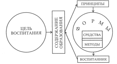 В наибольшей степени принципы зависят от цели воспитания. Выраженная в практическом, рабочем отношении в содержании образования и воспитания общая цель воспитания является тем императивом, который определяет характер и содержание системы принципов обучения и воспитания. Их требования реализуются через формы учебно-воспитательной работы как определенное сочетание средств и методов, обеспечивающих освоение воспитанниками содержания образования и воспитания, и достижение тем самым цели воспитания. Схематически эти связи можно изобразить следующим образом (схема 16):