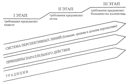 Коллектив - динамичное объединение. В своем развитии он проходит три стадии - этапа (по А.С. Макаренко) (схема 17). На первой стадии требования к воспитанникам предъявляет воспитатель, он организует и деятельность по реализации этих требований на основе увлечения воспитанников ближней, средней и дальней перспективами-целями (система перспективных линий).