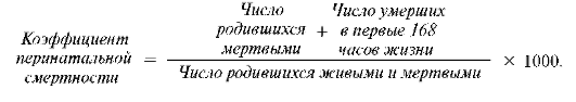 Смертность детей в перинатальном периоде характеризуется коэффициентом перинатальной смертности, который рассчитывается как отношение суммы числа родившихся мертвыми и числа умерших в первые 168 ч жизни к числу родившихся живыми и мертвыми.