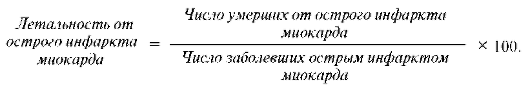 Помимо показателей смертности, в оценке здоровья населения, проживающего на отдельных административных территориях, используются показатели летальности от отдельных заболеваний, которые рассчитываются иначе. Так, если для расчета коэффициента смертности в качестве среды берется население, то при расчете показателя летальности такой средой служат больные. Например, летальность от острого инфаркта миокарда рассчитывается по следующей формуле и выражается в процентах (%).