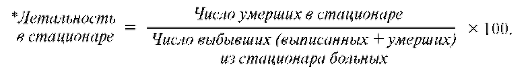 Для анализа качества лечения больных, находящихся в больничных учреждениях, используют другой, отличный от предыдущих показателей смертности и летальности, показатель летальности в стационаре. Он рассчитывается по следующей формуле и выражается в процентах (%).