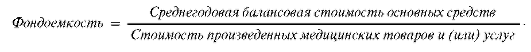 Показатель фондоемкости является обратным к показателю фондоотдачи и характеризует величину основных средств, необходимую для производства единицы продукции (медицинских товаров и услуг) стоимостью в 1 рубль. Он рассчитывается по формуле.