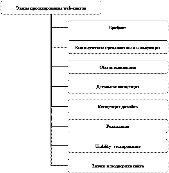 Разработка и создание профессионального web-сайта включает этапы: брифинг, коммерческое предложение/составление калькуляции, общая концепция, детальная концепция, концепция дизайна, реализация, usability-тестирование, запуск сайта, поддержка (рис.2).