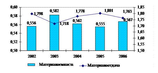 Материалоемкость работ на конец анализируемого периода составила 0,567 руб./руб. Динамика материалоотдачи показывает, что эффективность использования материальных ресурсов несколько снизилась в 2003 и 2006 годах. Это вызвано превышением темпов роста материальных затрат по сравнению с темпами роста стоимости выполненных работ.
