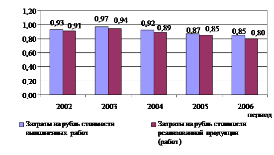 Для анализируемого предприятия характерно снижение затрат на один рубль стоимости работ, что ведет к увеличению прибыли. Так, затраты на рубль стоимости выполненных работ сократились с 0,93 рубля в 2002 году до 0,85 рубля в 2006 году. Это значит, что в 2006 году с каждого рубля стоимости выполненных работ 85 копеек – это затраты, а прибыль, следовательно, составит 15 копеек. В 2002 году прибыль на рубль выполненных работ составляла 7 копеек. Снижение затрат на один рубль стоимости работ происходит в результате повышения эффективности использования ресурсов, что находит свое выражение в повышении производительности труда, фондоотдачи и материалоотдачи.