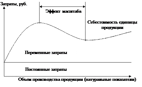 С динамикой переменных и постоянных затрат в зависимости от изменения объема производства продукции связано такое явление, как «эффект масштаба». Суть «эффекта масштаба» заключается в том, что с увеличением объема производства продукции (работ) себестоимость единицы продукции снижается, так как в силу неизменности постоянных затрат снижается величина постоянных затрат, приходящихся на единицу продукции (рис. 2.34.).
