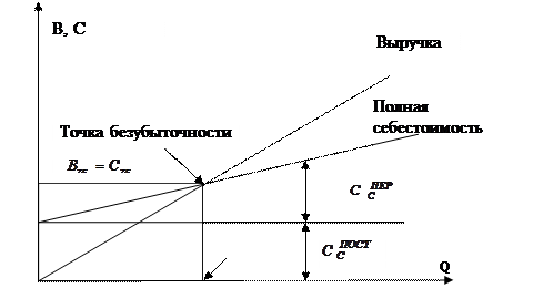 На основе данных о постоянных и переменных затратах рассчитывается безубыточный объем реализации продукции или точка безубыточности (