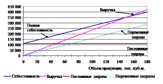 Линия фиксированных затрат показывает, что при изменении объема реализации от 0 до 180 тыс. м3 железобетона сумма постоянных затрат остается неизменной и составляет 112384 тыс. руб. Прямая переменных затрат показывает, что их общая сумма изменяется от 0 до 288000 тыс. руб., при этом полная себестоимость продукции изменяется от 112384 тыс. руб. при нулевом объеме продукции до 400384 тыс. руб. при объеме продукции 180 тыс. м 3. Прямая выручки от продаж показывает изменение суммы выручки от 0 руб. при нулевом объеме реализации до 423000 тыс. руб. при объеме реализации 180 тыс. м3.