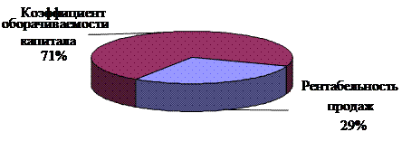 Рентабельность капитала увеличилась на 5,395%. Необходимо определить, в какой степени на ее увеличение повлияли рентабельность продаж и коэффициент оборачиваемости капитала. Для расчета будем использовать следующую формулу и последующие преобразования