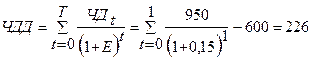 тыс. руб. > 0, следовательно, в бизнес инвестировать эффективно. Ожидаемую к получению через год сумму (950 тыс. руб.) мы уменьшили на альтернативную доходность 15% в год посредством нормы дисконта и уменьшили на величину инвестиций (600 тыс. руб.). В результате получили ЧДД = 226 тыс. руб.