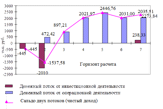 3. Сальдо двух потоков или чистый доход на шаге t , тыс. руб. | –445 | –1537,58 | 897,21 | 2021,97 | 2446,76 | 2031,00 | 2273,84 |