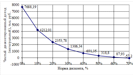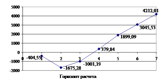 7. Интегральный чистый дисконтированный доход (нарастающим итогом) , тыс. руб. | –404,55 | –1675,28 | –1001,19 | 379,84 | 1899,09 | 3045,53 | 4212,01 |