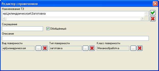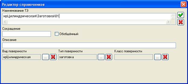 - из выпадающих списков вводим вид поверхности, тип поверхности и класс поверхности. Если соответствующих данных в списках нет, их также нужно создавать путем редактирования справочника (закладка «справочники» - открыть группу-создать (если нужно) группу-создать новый ТЭ (вид, тип, класс)).