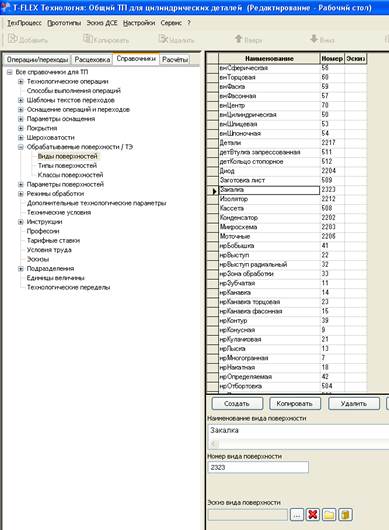Некоторые поверхности будут оригинальными, например, для выбора операции «закалка ТВЧ» можно создать поверхность «закалка». По существу, это характеристика детали в зависимости от ее наличия или отсутствия будет или нет операция закалка выбираться. Такую поверхность можно создать только через коррекцию справочника. Необходимо корректировать справочники «виды поверхностей» и «типы поверхностей»