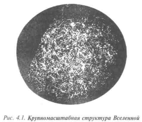 Если брать не отдельные участки Метагалактики, а ее крупномасштабную структуру в целом, то очевидно, что в этой структуре не существует каких-то особых, чем-то вьщеляющихся мест или направлений и вещество распределено сравнительно равномерно.