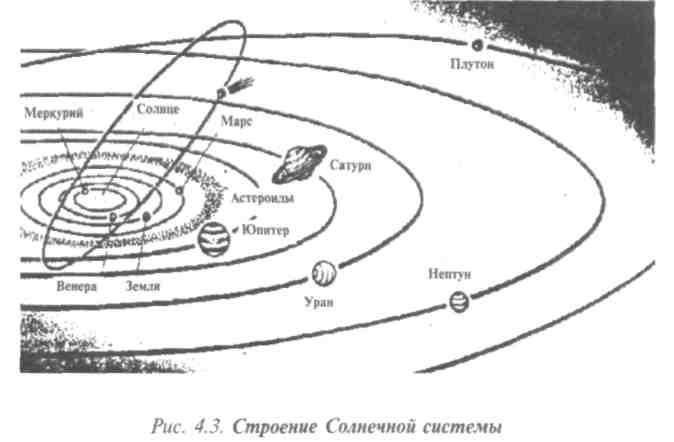 ря силе притяжения центрального тела — Солнца. Солнечная система является упорядоченной системой, имеющей свои закономерности строения. Единый характер Солнечной системы проявляется в том, что все планеты вращаются вокруг Солнца в одном и том же направлении и почти в одной и той же плоскости. Большинство спутников планет (их лун) вращается в том же направлении и в большинстве случаев в экваториальной плоскости своей планеты. Солнце, планеты, спутники планет вращаются вокруг своих осей в том же направлении, в котором они совершают движение по своим траекториям. Закономерно и строение Солнечной системы: каждая следующая планета удалена от Солнца примерно в два раза дальше, чем предыдущая. Принимая во внимание закономерности строения Солнечной системы, кажется невозможным ее случайное образование.