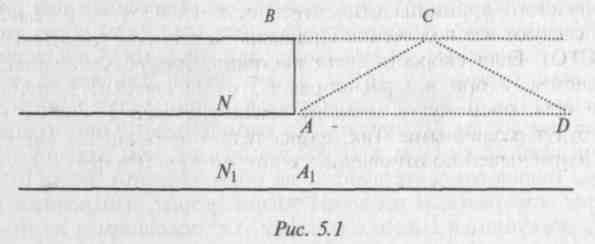 В точке Al на платформе находится наблюдатель (или прибор, фиксирующий эксперимент). На полу вагона в точке А размещен фонарик. Когда происходит совмещение точки А в вагоне с точкой А 1на платформе, фонарик включается, появляется луч света. Так как скорость его конечная, хотя и большая, то для того чтобы достигнуть потолка вагона, где расположено зеркало, и отразиться обратно, необходимо время, за которое поезд уйдет вперед.