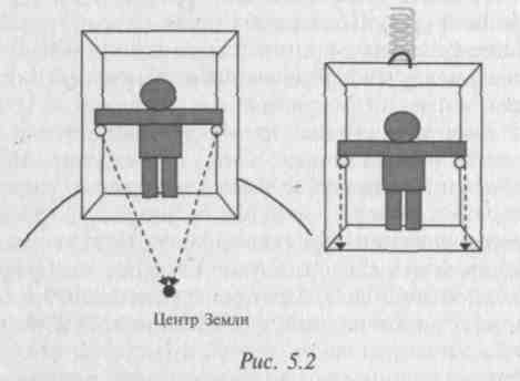 дятся они в покое или в движении. Представим себе, что в какой-то момент времени канат, на котором подвешен лифт, обрывается, и наблюдатели в нем оказываются в состоянии свободного падения. В этом случае они не смогут определить, какое из двух противоположных утверждений будет истинным: 1) лифт движется в поле тяготения Земли; 2) лифт покоится в отсутствие поля тяготения. Если же в отсутствие поля тяготения Земли лифт будут тянуть вверх с ускорением g, то наблюдатели также не смогут выбрать истинное утверждение из двух противоположных: 1) лифт покоится в поле тяготения Земли; 2) лифт движется с ускорением в отсутствие поля тяготения.