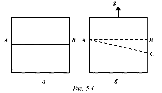 мира. Эйнштейн в общей теории относительности сделал геометрию физической экспериментальной наукой, которая подтвердила характер пространства Римана. Здесь опять призовем на помощь мысленный эксперимент. Представим себе, что лифт покоится в отсутствие гравитационного поля (см. рис. 5.4, а). В стене лифта сделано отверстие А, через которое луч света падает на его противоположную сторону. Линия АВ — прямая. Пусть теперь лифт начинает движение вверх с ускорением g, т.е. 9,8 м/с2. За время, пока свет проходит расстояние между стенками, лифт смещается вверх, и луч света попадает уже не в точку B, а в точку С (см. рис. 5.4, б).