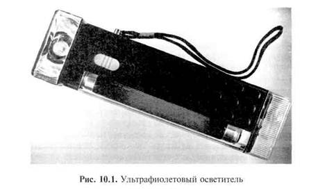 Средства освещения — это разнообразные приборы, позволяющие создать общее рассеянное, направленное, моно- и полихроматическое освещение. В качестве источников света используются переносные фотоосветители, бытовые фонарики, электронные фотовспышки и другая осветительная аппаратура, важнейшими частями которой являются рассеиватели, отражатели, светофильтры, защитные экраны, влияющие на направление, интенсивность, волновой диапазон и другие характеристики светового потока. К специальным источникам относятся ультрафиолетовые осветители (рис. 10.1), позволяющие обнаружить слабовидимые или невидимые следы крови, спермы, пота и других выделений человека, некоторых химических веществ (нефтепродуктов, клея и пр.). Под действием ультрафиолетовых лучей некоторые из этих объектов люминесцируют или сильно отличаются по оттенку от фона. Однако следует помнить, что действие ультрафиолета должно быть кратковременным (не более 5 с), поскольку он может вызвать необратимые изменения объекта. Источниками инфракрасных лучей являются электронно-оптические преобразователи (ЭОП), позволяющие выявить частицы копоти, краски, металла, следы выстрела.