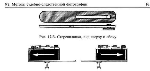 Для съемки из двух точек (первый способ) малоформатными аппаратами типа «Зенит» или зеркальными фотокамерами иного типа в следственном портфеле имеется специальная стереопланка (стереоскопическая шта-тивная приставка) (рис. 12.3). Она представляет собой металлическую планку с прорезью, в которой перемещается винт. Планка имеет гнездо для крепления к обычному фотоштативу. На винт, скользящий по прорези планки, крепится фотоаппарат, который фиксируется у левого края прорези, после чего производится фотосъемка. Затем аппарат перемещается к правому краю прорези и вновь фиксируется с помощью винта. В этом положении получают второй фотоснимок. Естественно, что условия съемки в обоих случаях (диафрагма, выдержка, освещение) должны быть одинаковы (рис. 12.4).