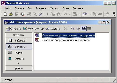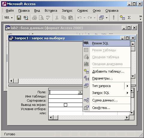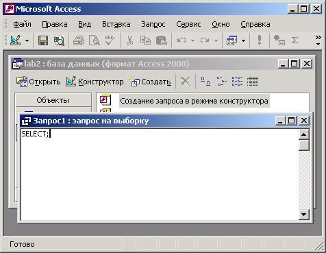 В лабораторной работе следует использовать второй способ, так как при использовании визуального конструктора запросов часть средств языка SQL недоступна.