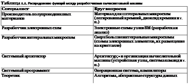 Вычислительная машина как закопченный объект являет собой плод усилий специалистов в самых различных областях человеческих знаний. Каждый специалист рассматривает вычислительную машину с позиций стоящей перед ним задачи, абстрагируясь от несущественных, по его мнению, деталей. В табл. 1.1 перечислены специалисты, принимающие участие в создании ВМ, и круг вопросов, входящих в их