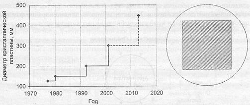Точки излома на графике соответствуют годам, когда переход на новый размер кристалла становится повсеместным. Каждому переходу обычно предшествуют 2-3-летние исследования, а собственно переход на пластины увеличенного диаметра происходит в среднем один раз в 9 лет.