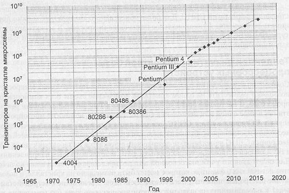 Рис 1.11. Тенденции увеличения количества транзисторов на кристаллах процессорных СБИС