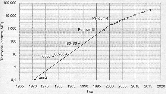 Рис. 1.12. Тенденции увеличения внутренней тактовой частоты процессорных СБИС